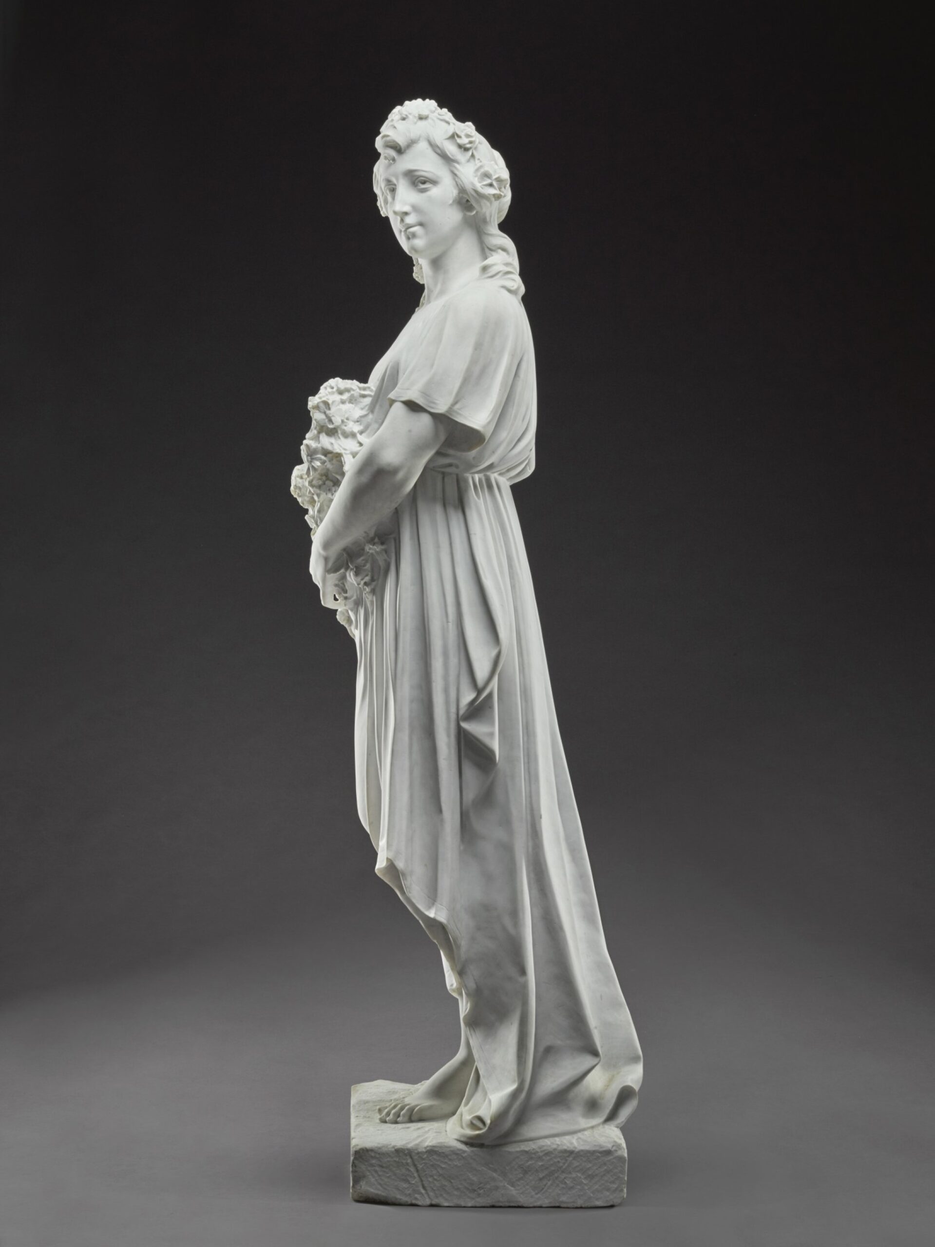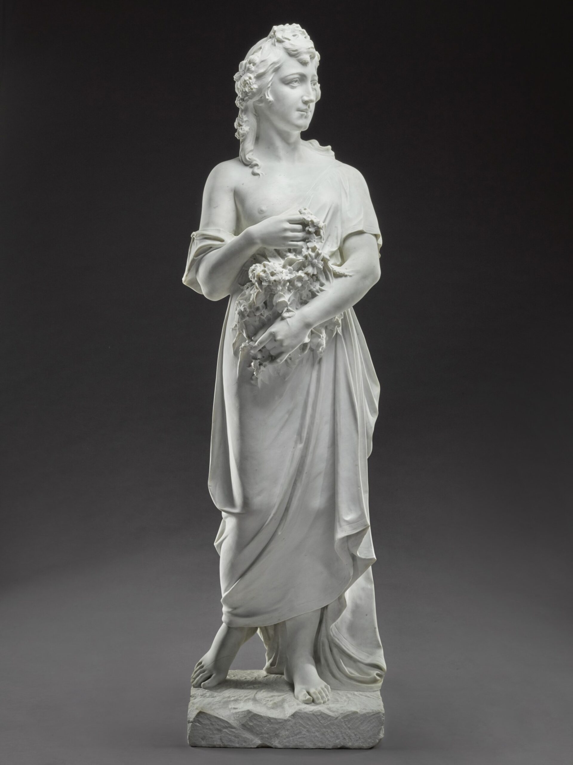 This exquisite marble sculpture splendidly captures the essence of Spring through the portrayal of an elegant young woman. Standing in a graceful pose, she is draped in a flowing robe that modestly reveals one shoulder and the gentle arc of her breast, embodying themes of fertility, renewal, and natural beauty. In her hands, she holds a bouquet of freshly picked flowers which serve as tokens of the blossoming vitality associated with the season.