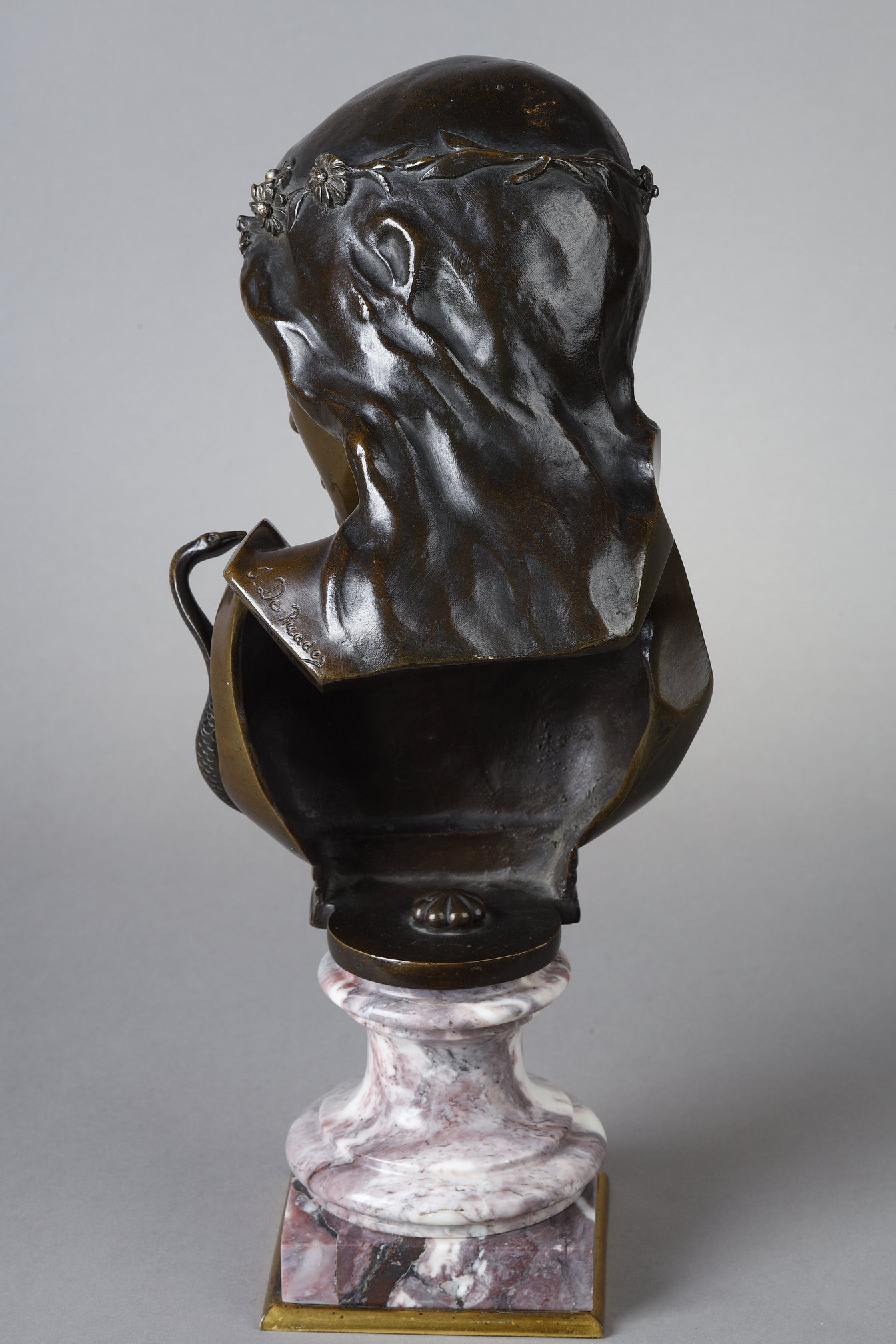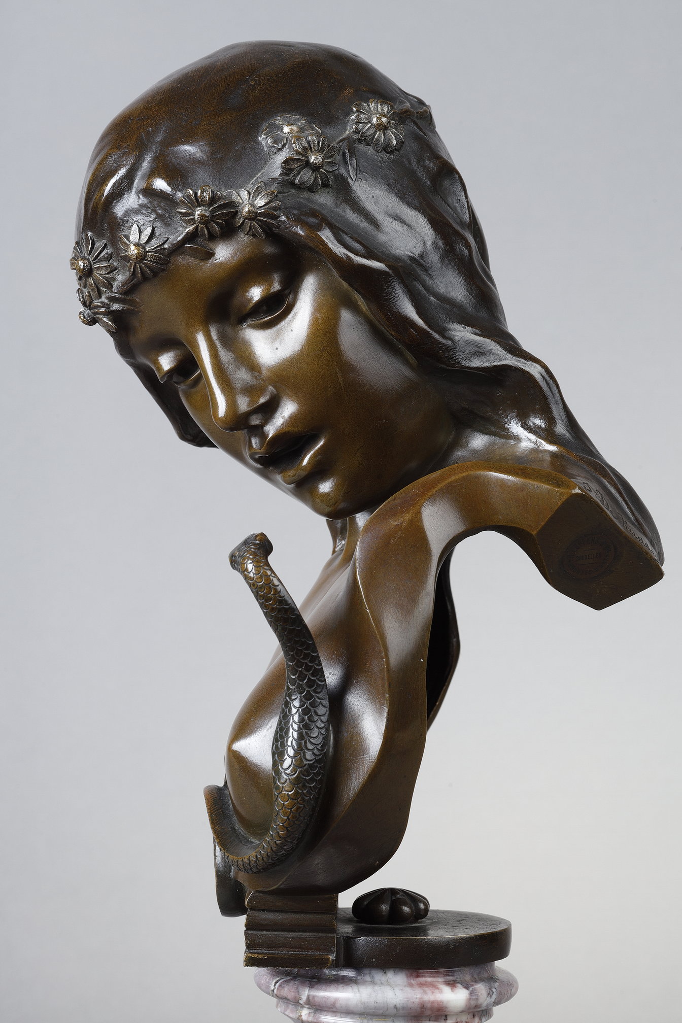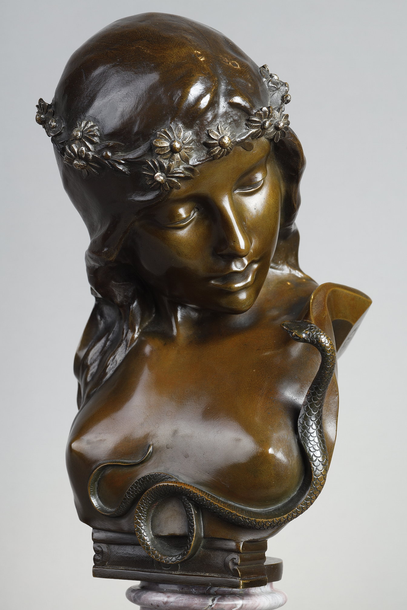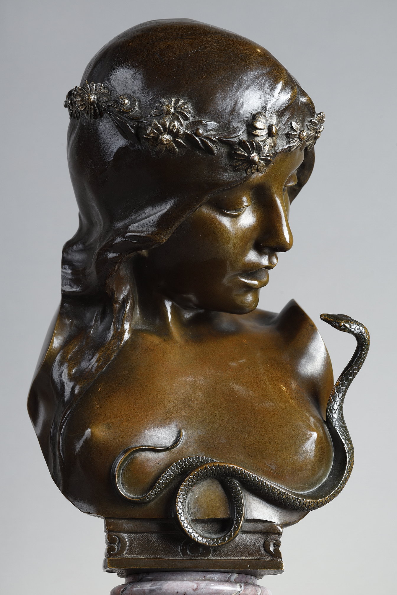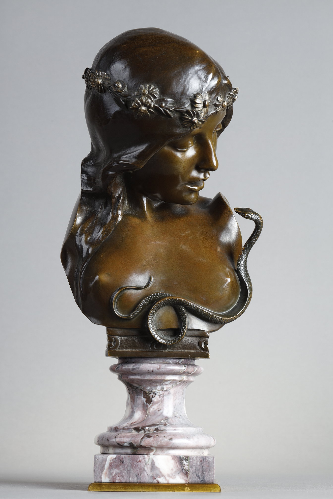The bust is elegantly modeled, capturing Cleopatra’s serene beauty and introspective gaze, framed by a delicate wreath of flowers. An asp—a coiled serpent symbolic of her fate—creeps across her chest. The piece blends Art Nouveau fluidity and decorative motifs with a classical foundation, fusing grace and gravitas.