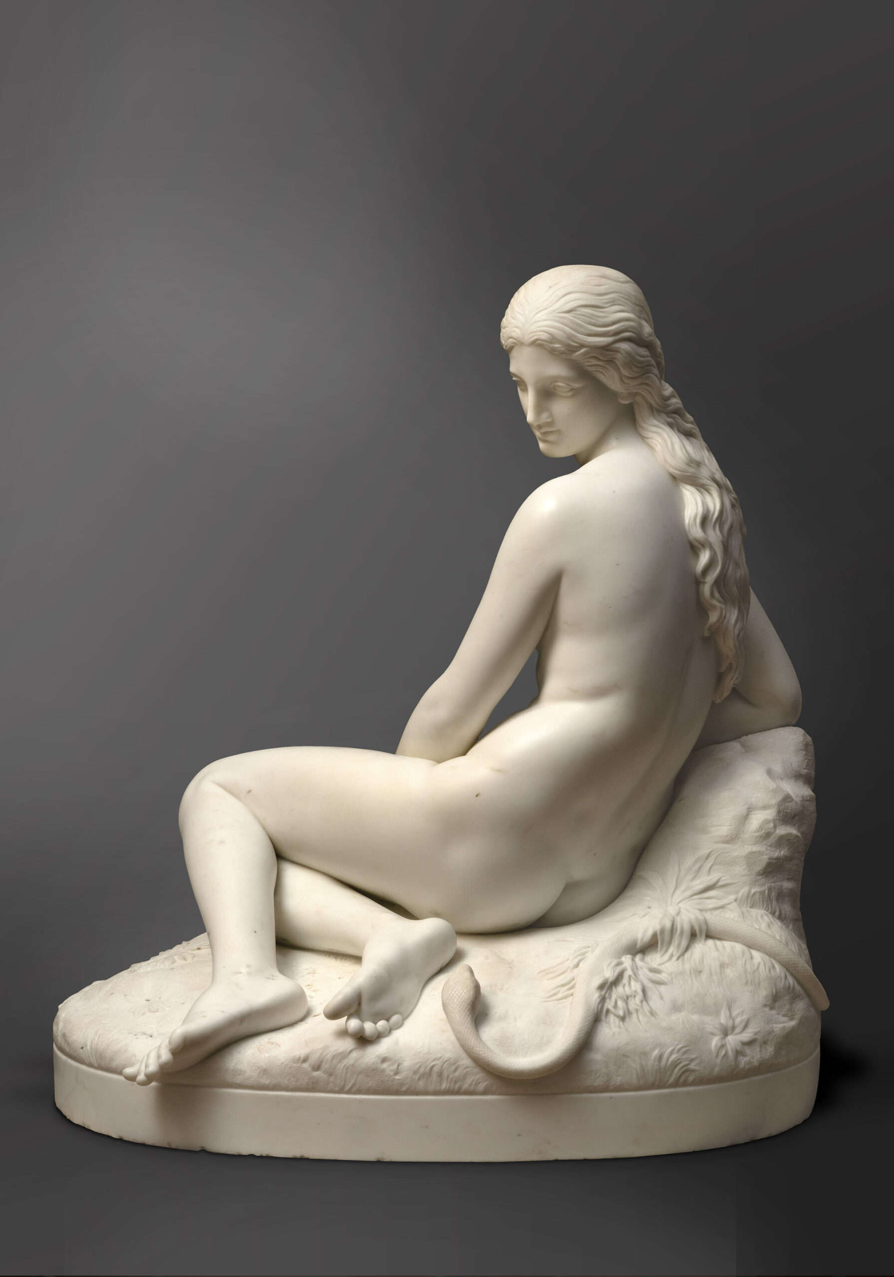La sculpture Ève, nue et assise du sculpteur britannique John Warrington Wood (1839–1886) représente une figure féminine dénudée dans une posture calme et introspective. Inspirée du personnage biblique d’Ève, l’œuvre revisite le thème intemporel de la tentation. Tournée légèrement de profil, la figure repose au-dessus d’un serpent enroulé à ses pieds — une référence explicite au récit de la Genèse. Pourtant, l’expression de son visage reste sereine, empreinte de méditation plutôt que de culpabilité.