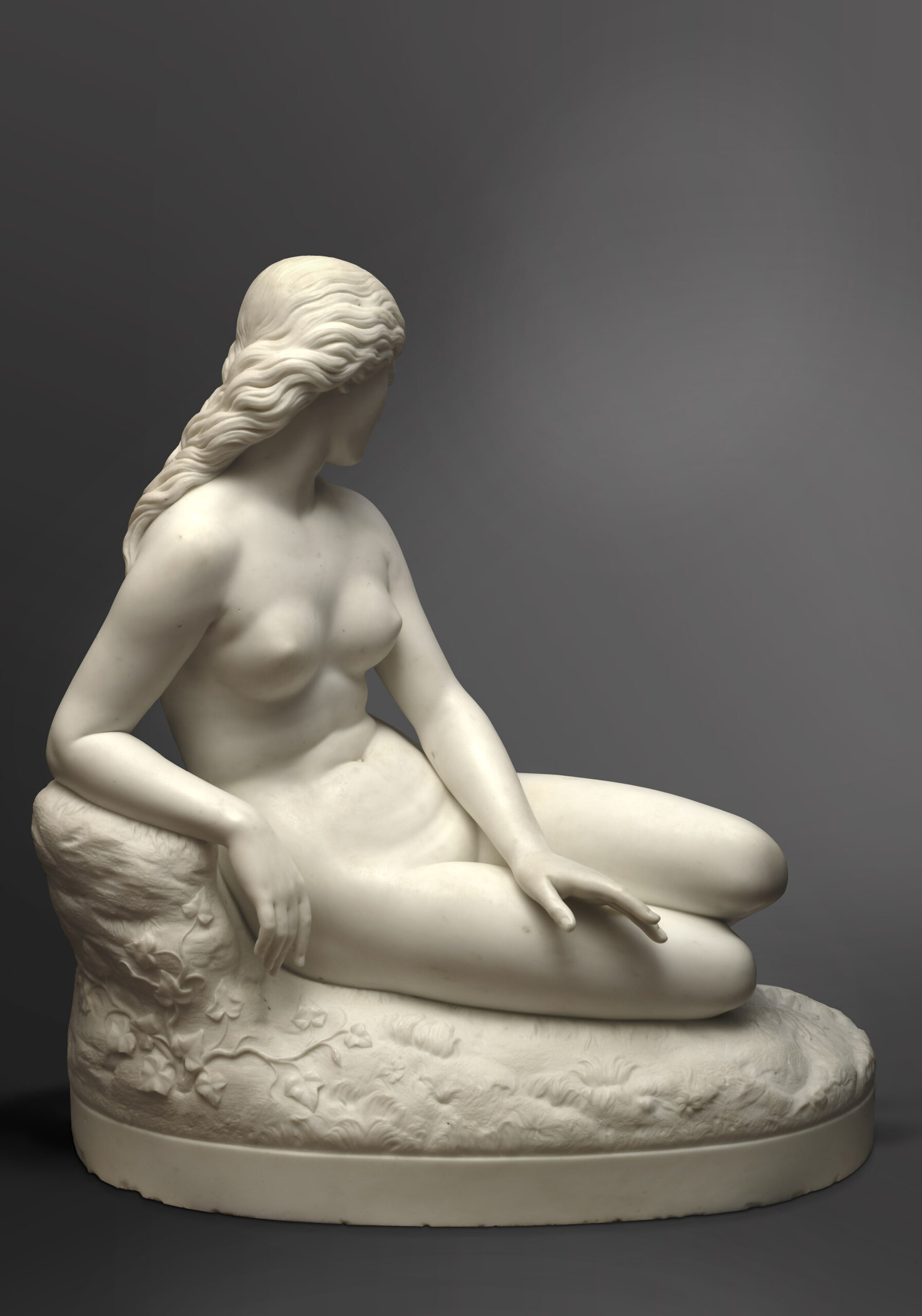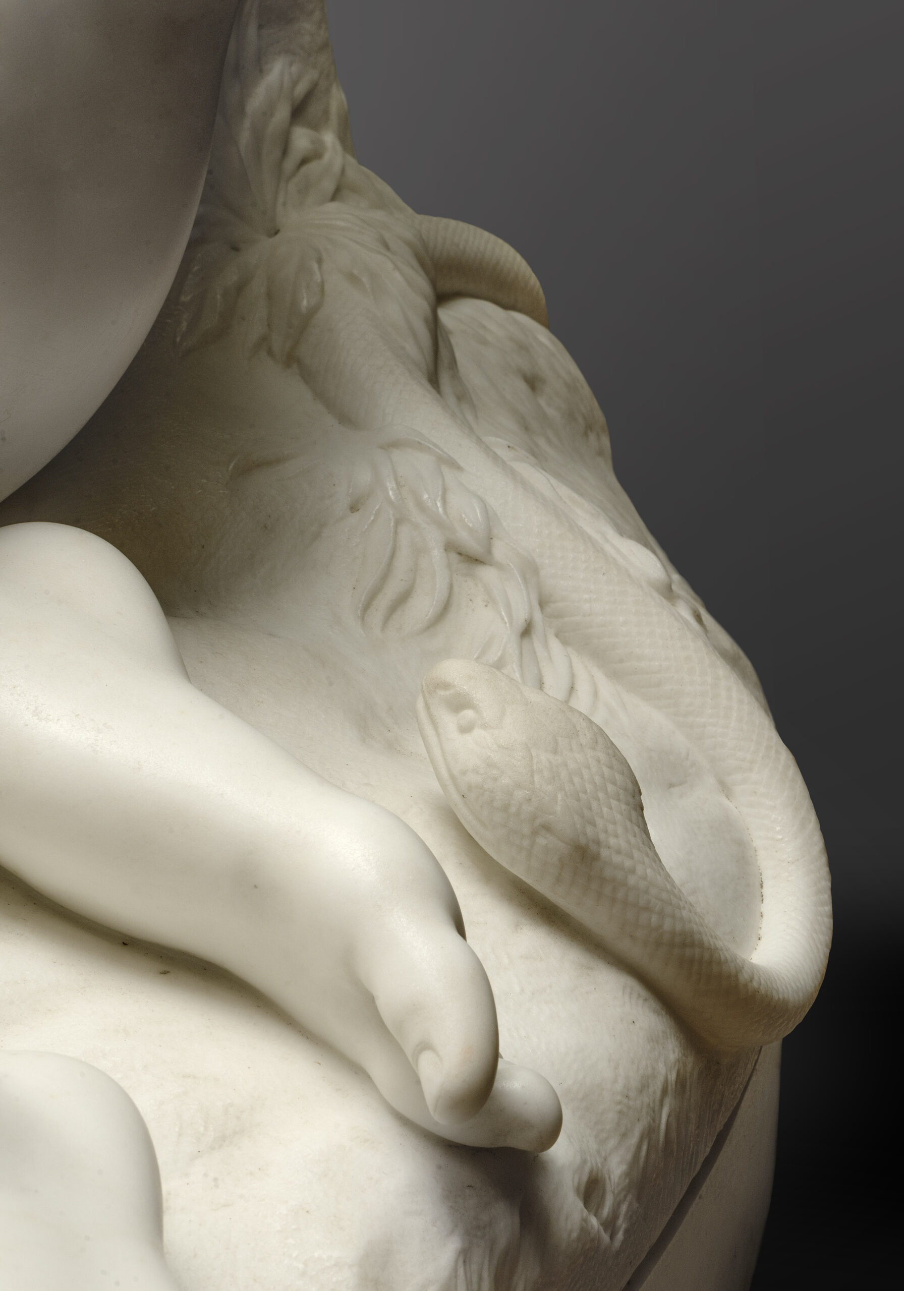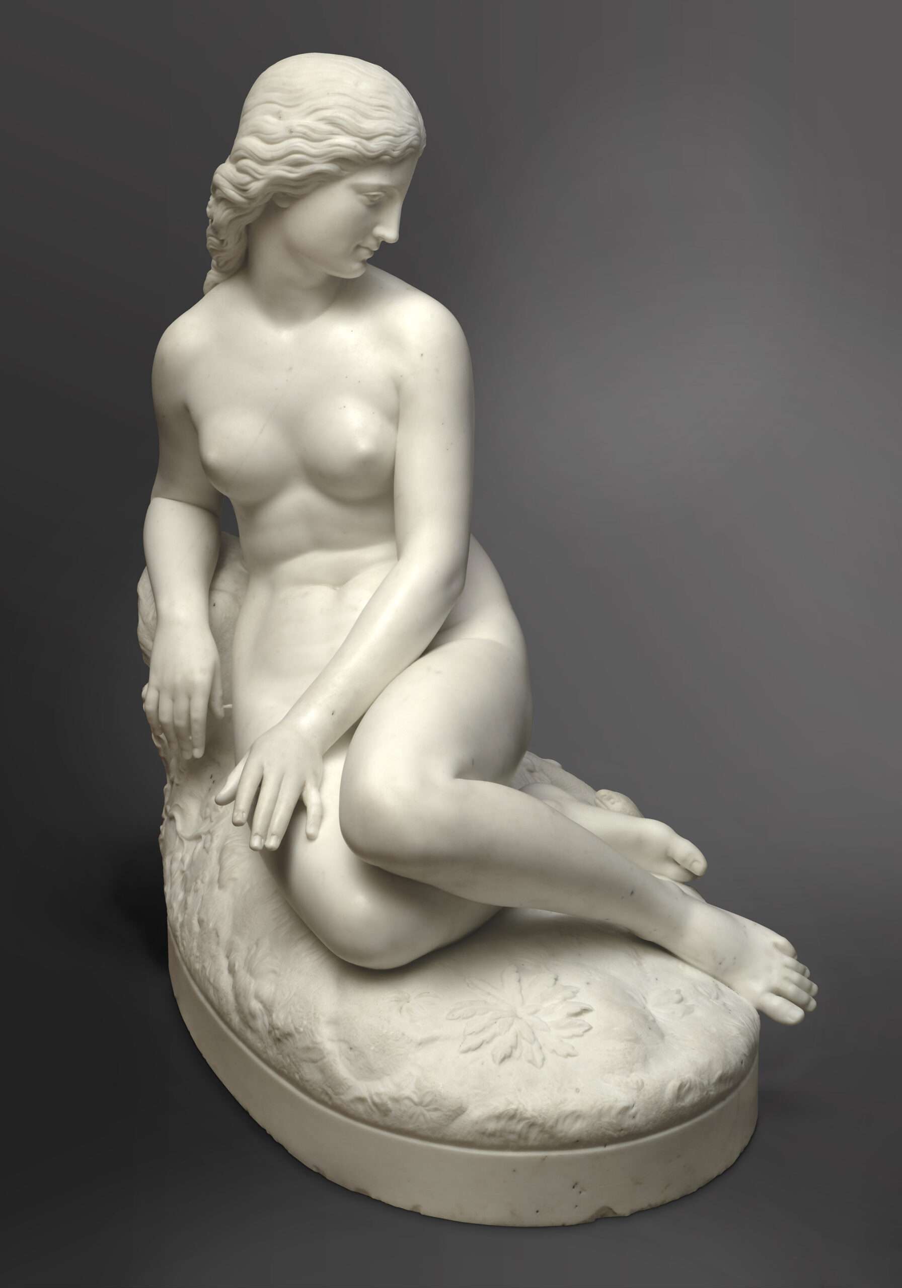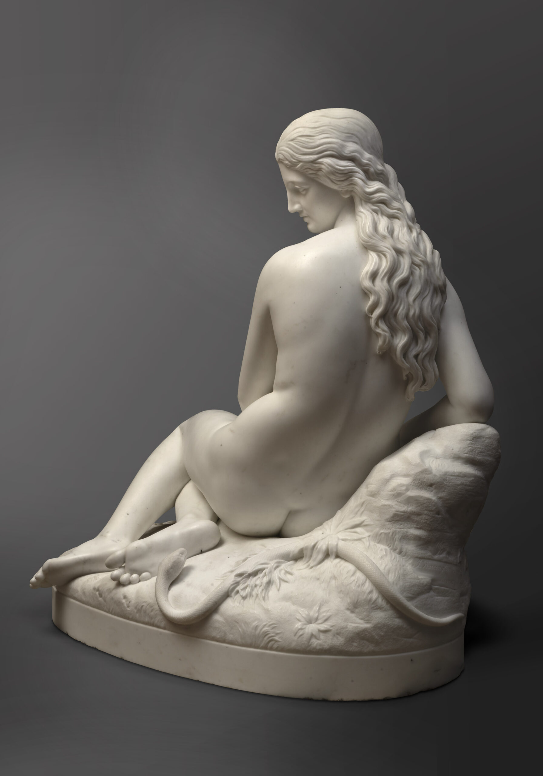 Réalisée à Rome, où Warrington Wood installa son atelier dès 1865, la sculpture porte l’inscription « J. Warrington Wood, Roma ». Le modèle fut exposée à la Royal Academy de Londres en 1869, à une époque où l’artiste présentait régulièrement ses œuvres dans les salons londoniens. Ancrée dans la tradition néoclassique, Ève met en avant la forme humaine idéalisée, la précision anatomique et une profondeur psychologique subtile. Le modelé fluide des membres, la douceur du traitement de la peau et la finesse de la chevelure témoignent d’une grande maîtrise technique.