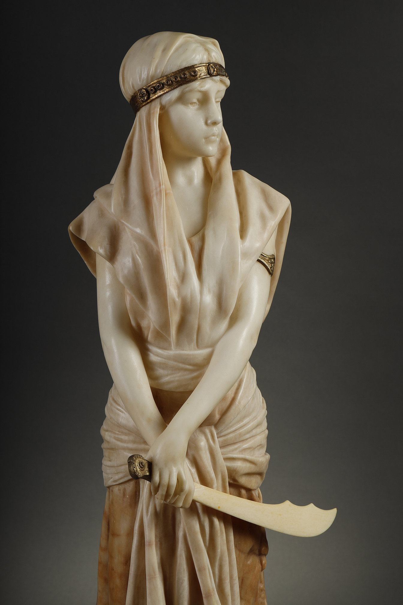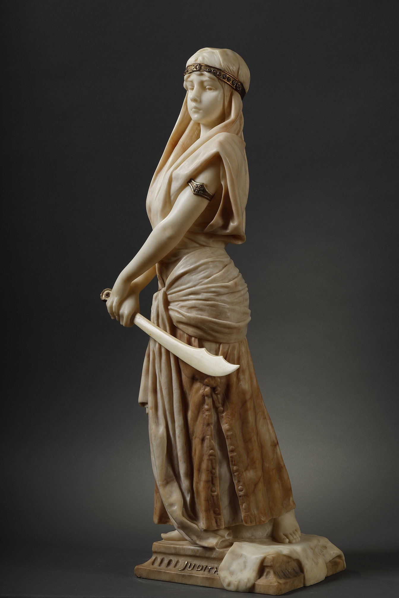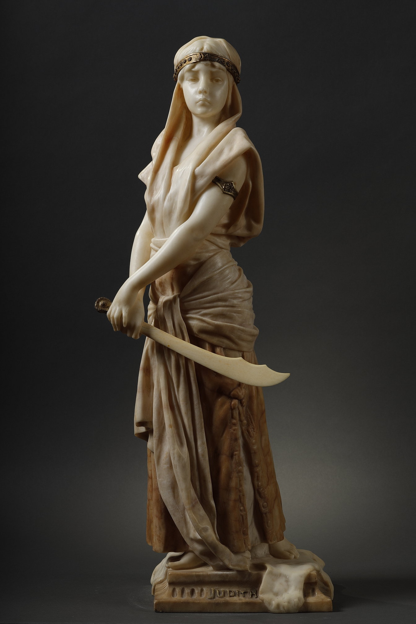 Réalisée en albâtre — matériau prisé pour sa translucidité délicate — Judith illustre la maîtrise subtile du sculpteur du matériau et sa célébration de la force féminine. Le jeu de lumière et d’ombre sur les surfaces lisses et gravées amplifie la présence dramatique et la profondeur émotionnelle de l’oeuvre.