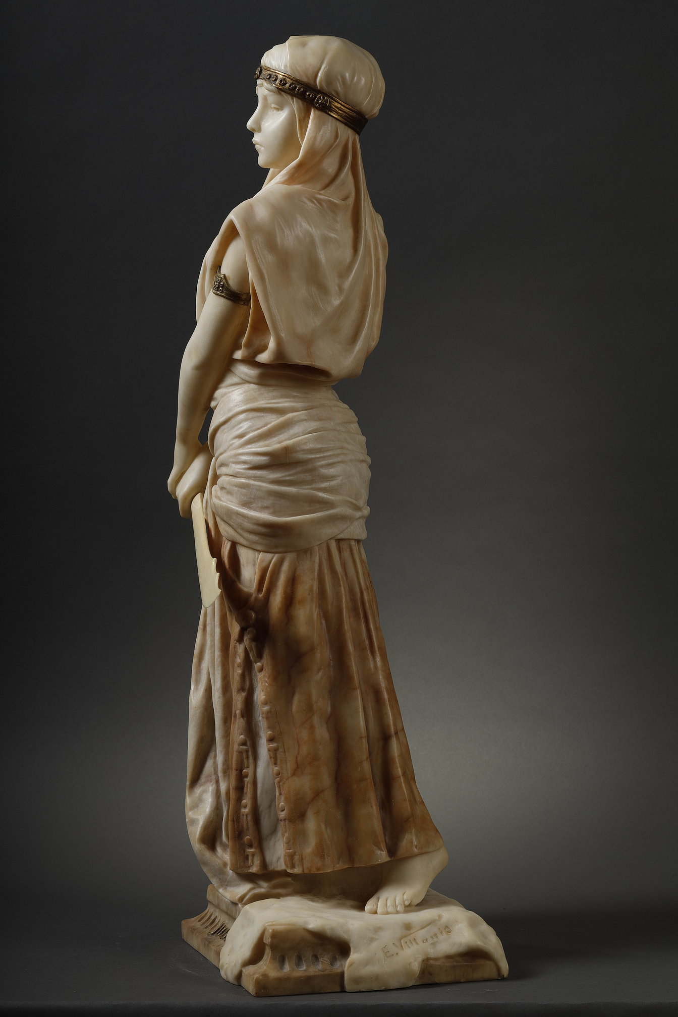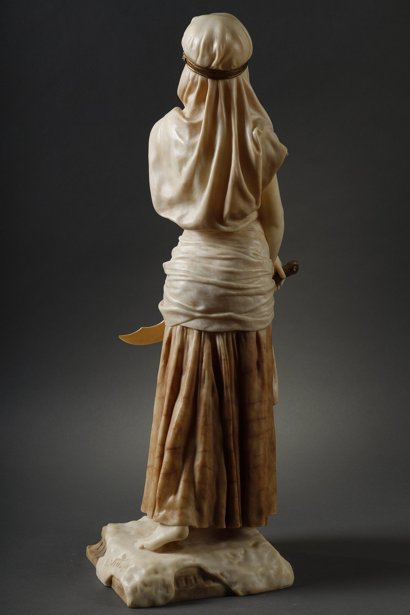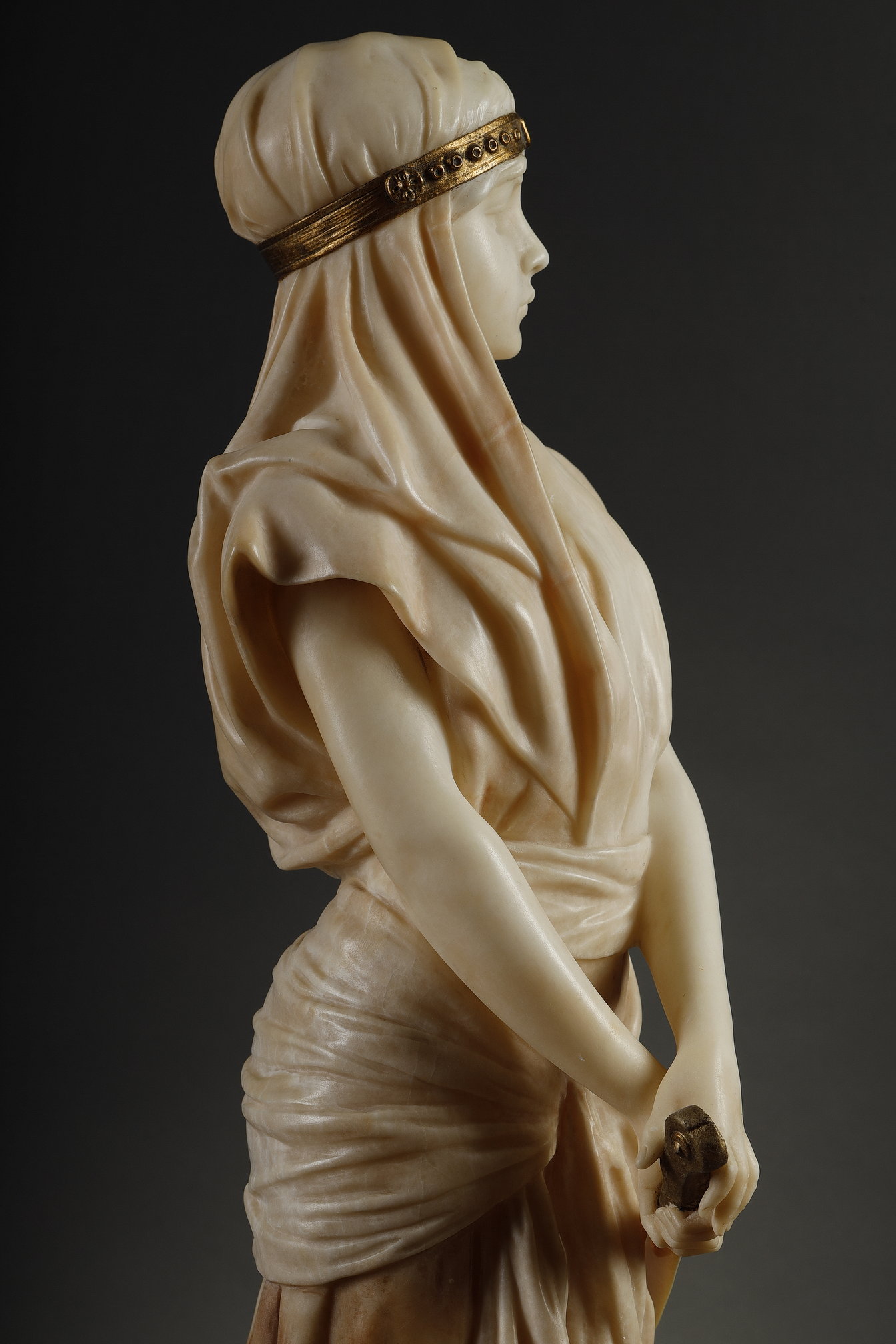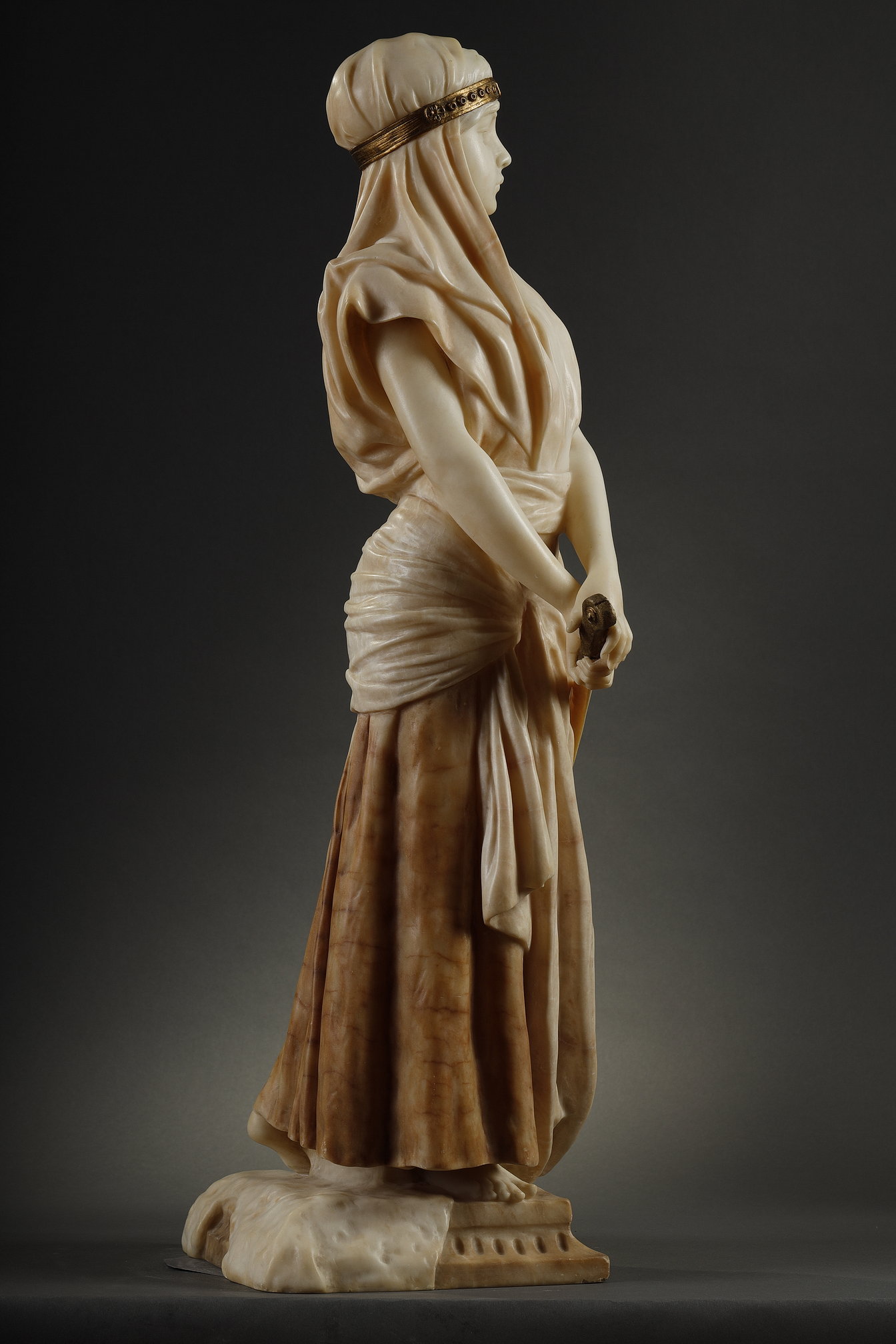 Réalisée en albâtre — matériau prisé pour sa translucidité délicate — Judith illustre la maîtrise subtile du sculpteur du matériau et sa célébration de la force féminine. Le jeu de lumière et d’ombre sur les surfaces lisses et gravées amplifie la présence dramatique et la profondeur émotionnelle de l’oeuvre.