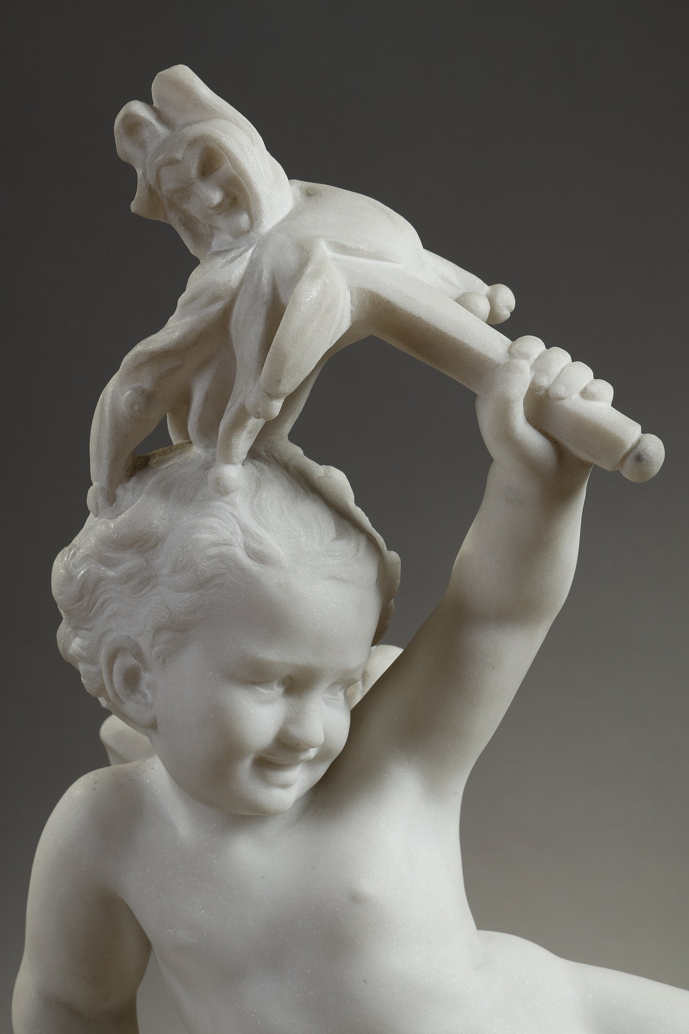 Dans cette œuvre, Carpeaux saisit avec éclat l’émotion vibrante et le mouvement dynamique caractéristiques de son style. La pièce représente un enfant ailé – allégorie de l’amour – brandissant une marotte. Ce sceptre coiffé d’une tête de fou symbolise la folie, créant un contraste saisissant entre l’innocence et la dérision.