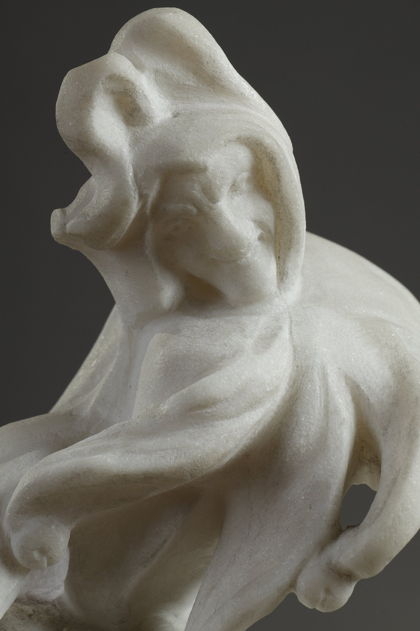 L’attention portée aux détails est frappante : boucles souples, drapé délicat, sourire malicieux – autant d’éléments témoignant d’une virtuosité technique exceptionnelle. Le poli du marbre accentue ces effets, conférant à la figure une luminosité presque vivante.
