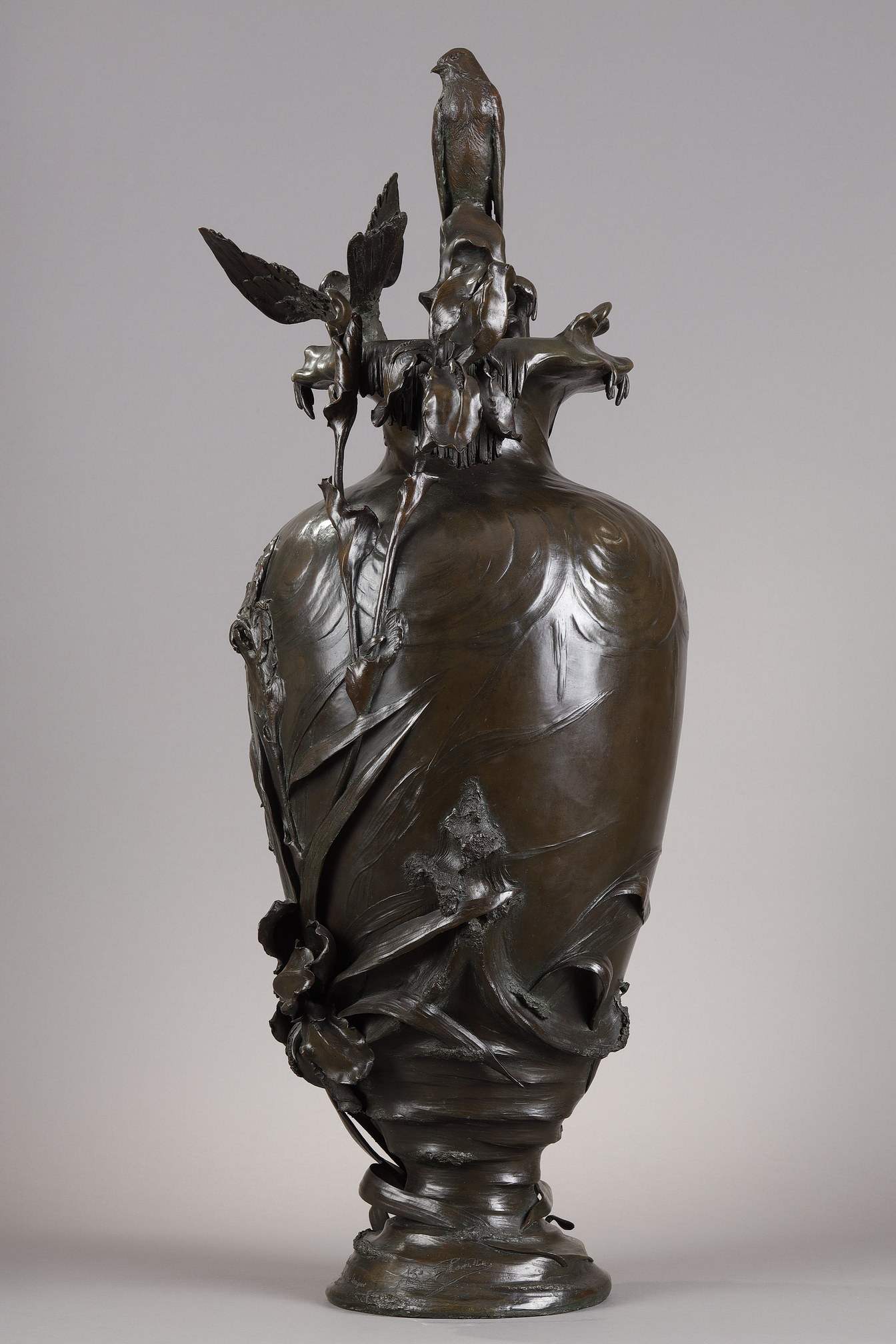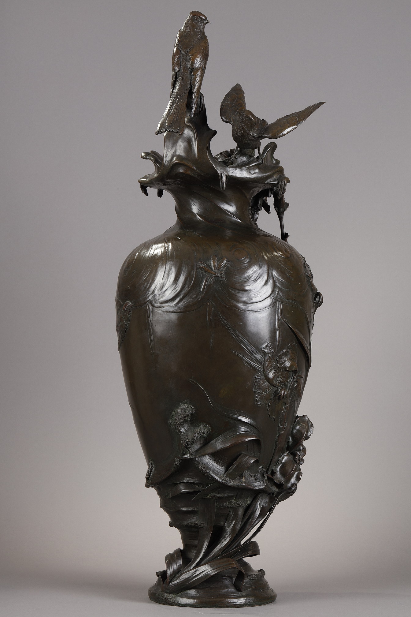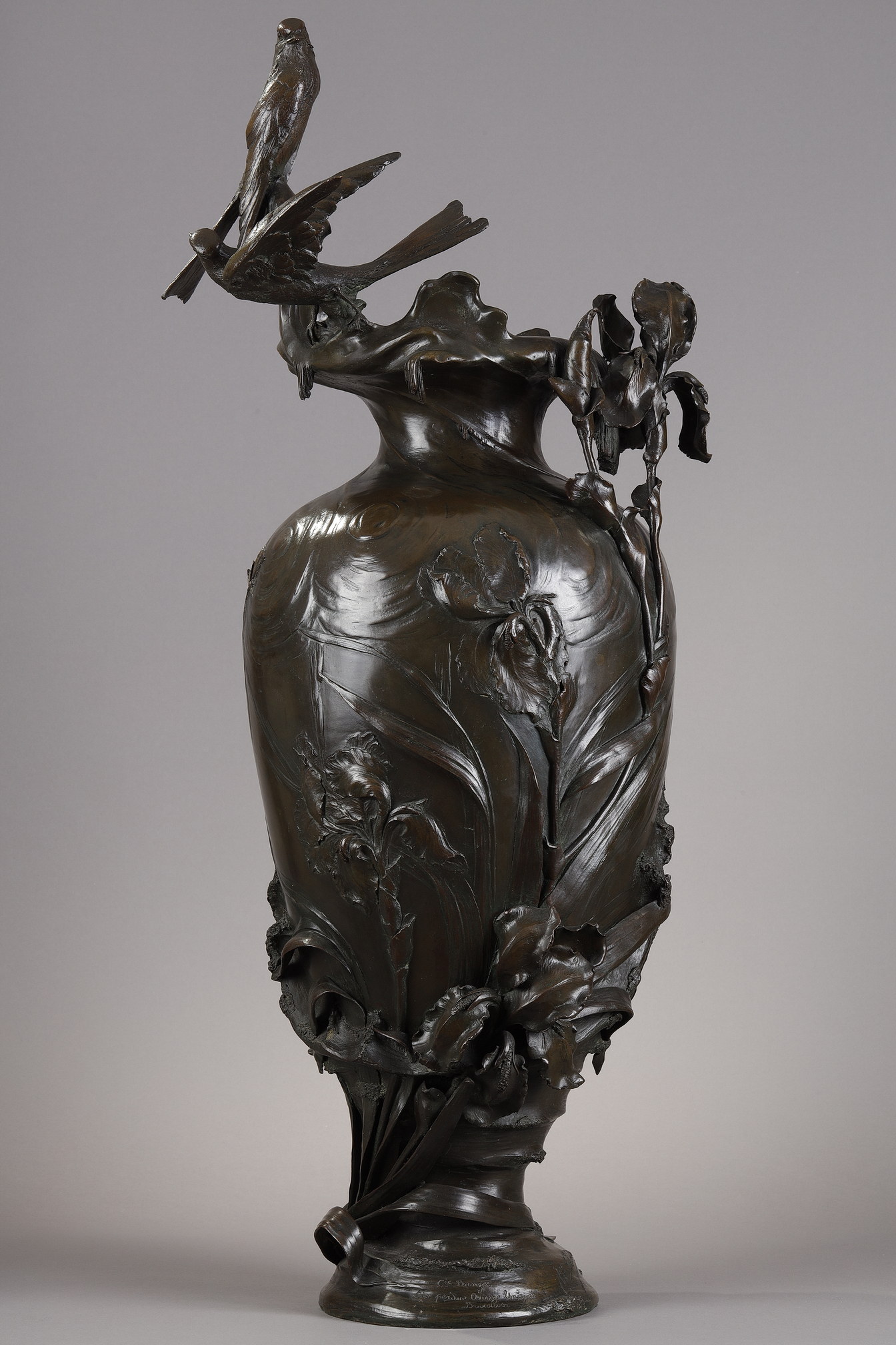Le premier vase est orné de roseaux et de plantes aquatiques, ses lignes élégantes couronnées par deux hirondelles de cheminée posées sur le rebord. Le second présente des iris finement sculptés et est surmonté de deux hirondelles de fenêtre, saisies dans le mouvement de leurs ailes. Le modelé naturaliste de la flore et de la faune, animé par un jeu rythmique de lignes verticales et diagonales, reflète l’esthétique organique du premier Art nouveau belge. Ces motifs récurrents – hirondelles, iris, roseaux et fleur de lys – sont porteurs de symboles : liberté, pureté, résilience et renouveau.