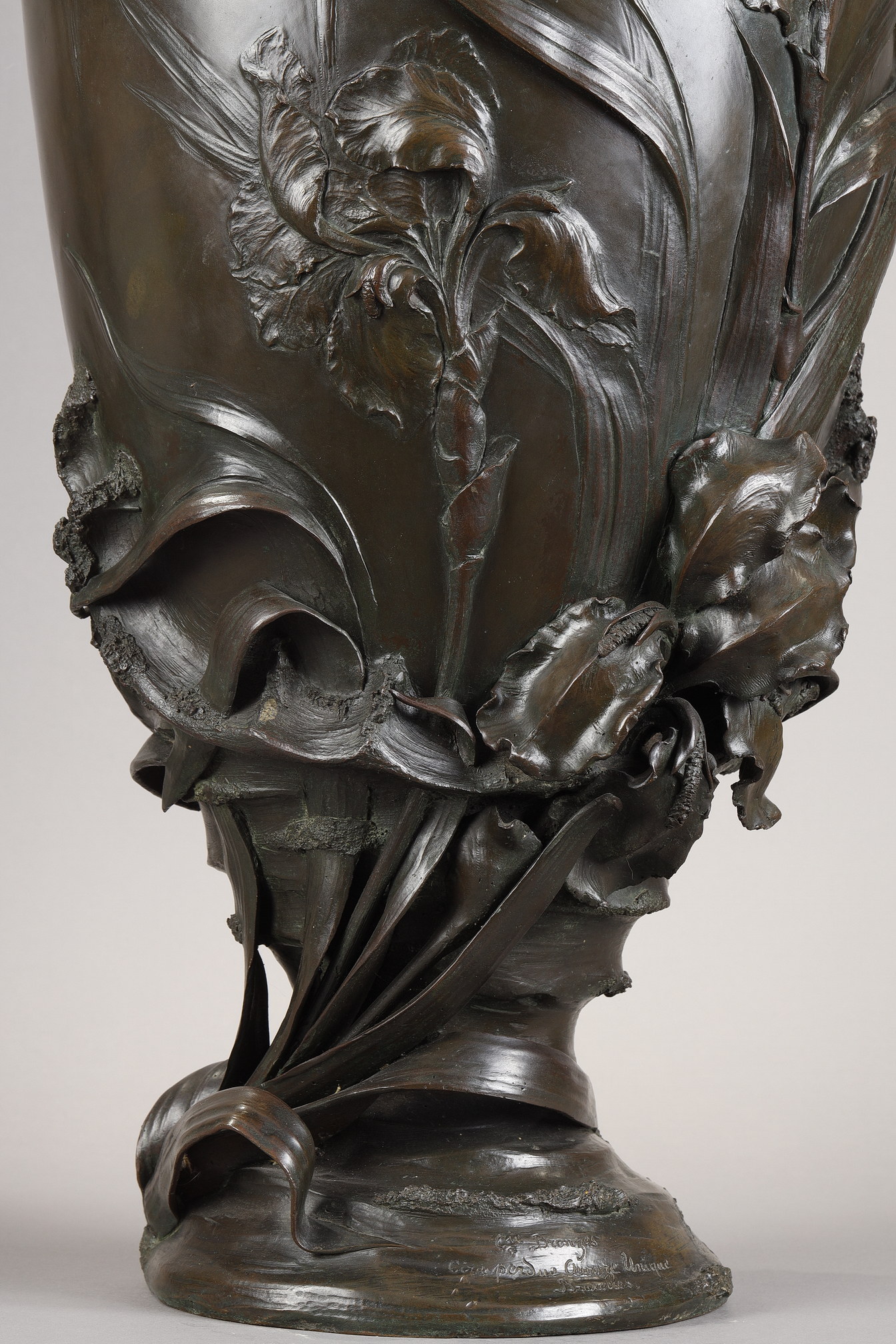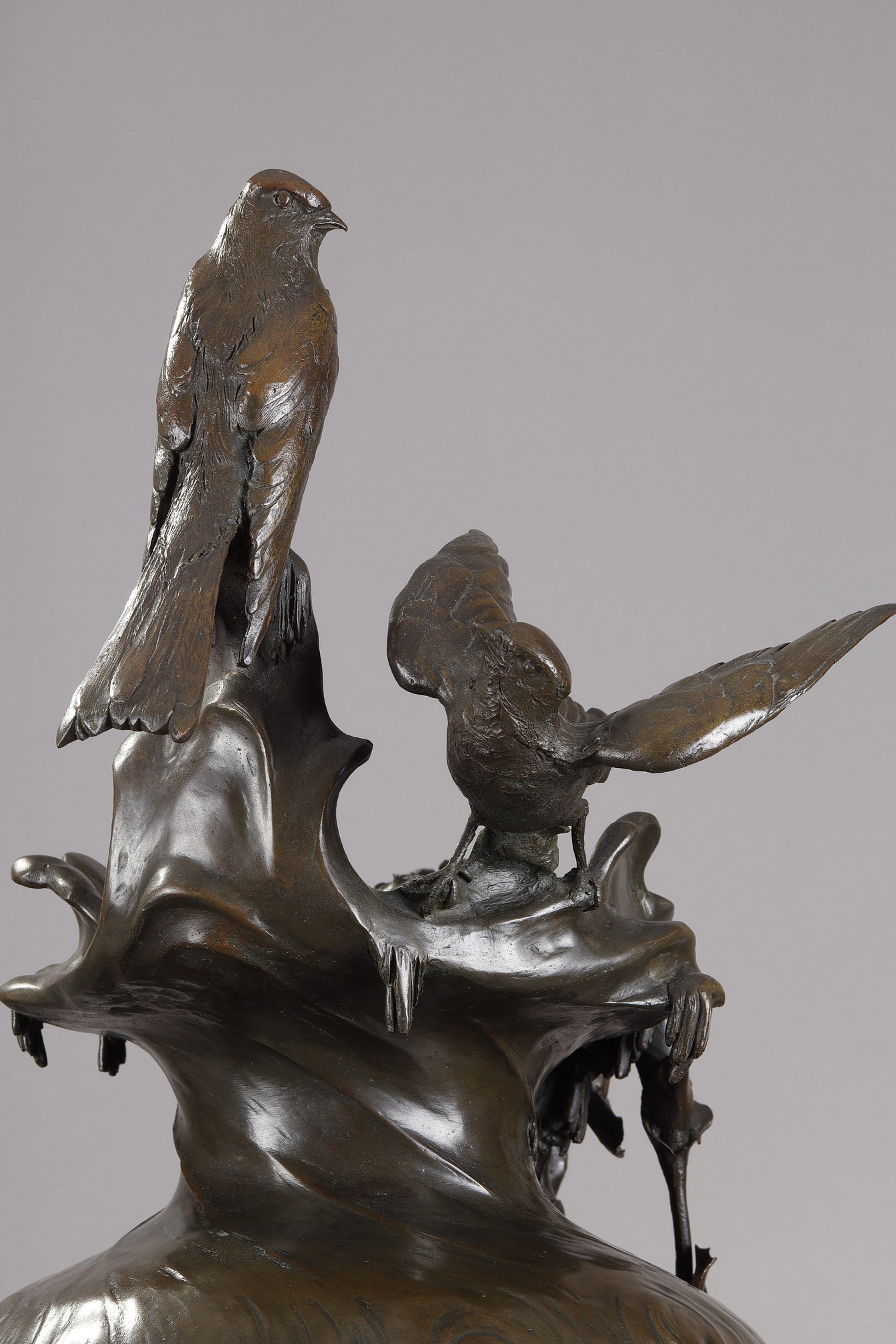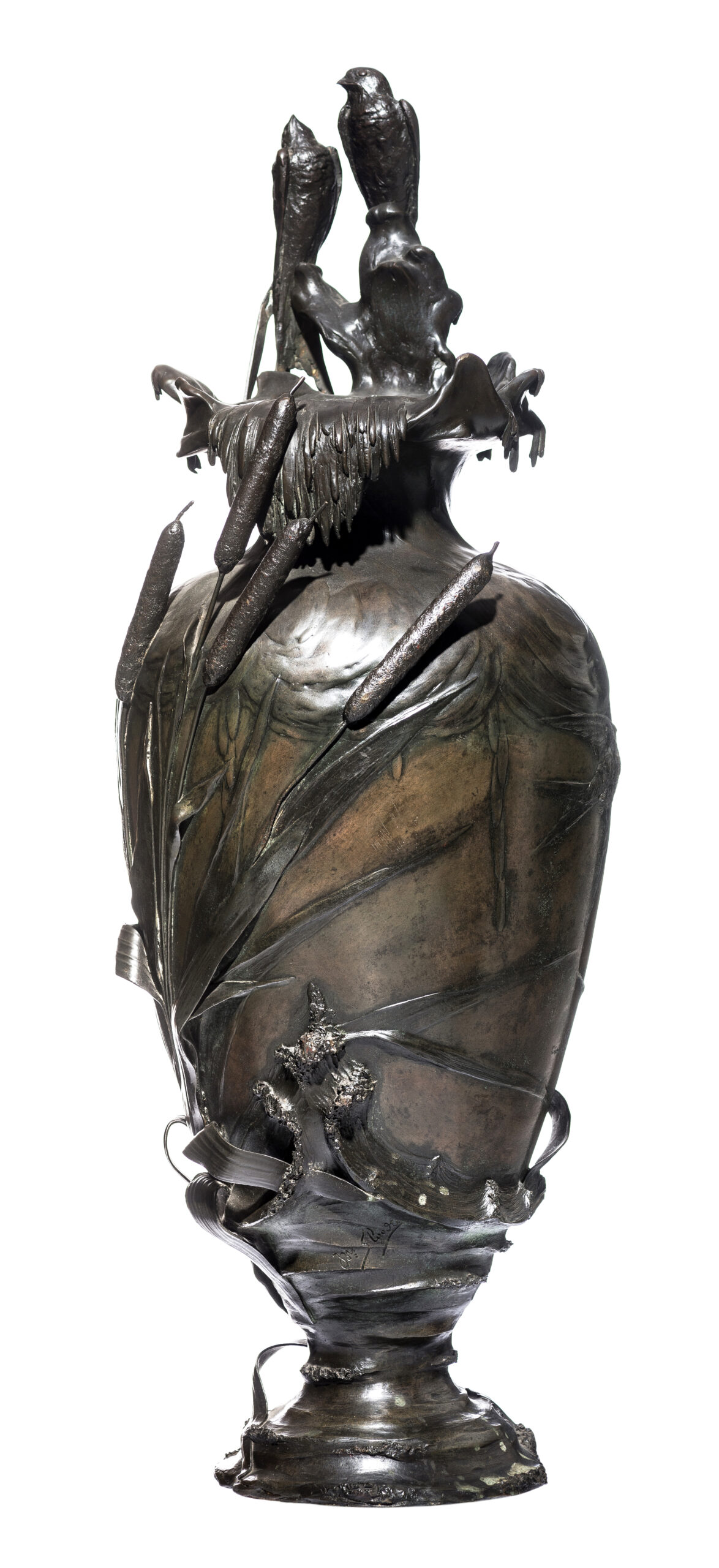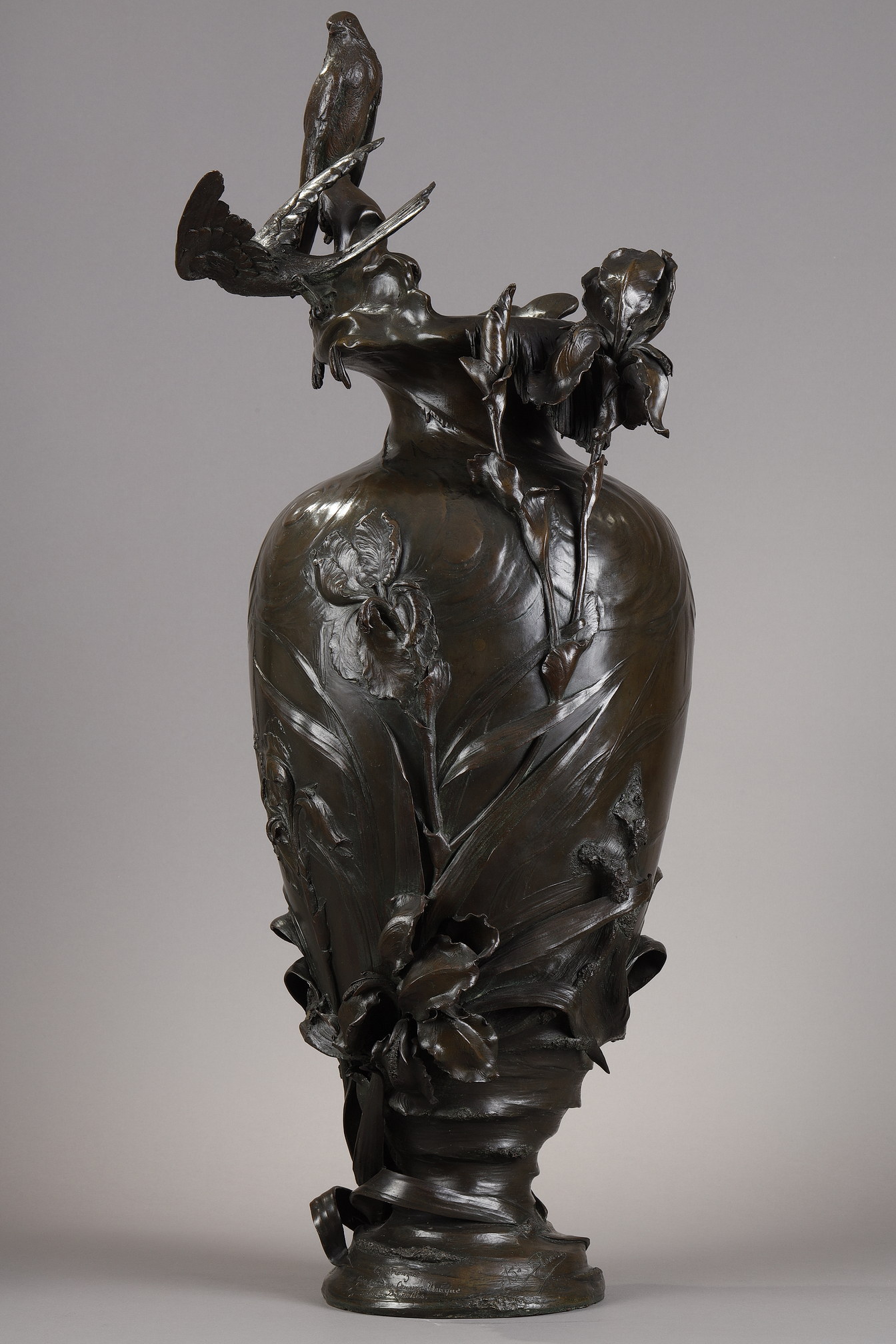 Le premier vase est orné de roseaux et de plantes aquatiques, ses lignes élégantes couronnées par deux hirondelles de cheminée posées sur le rebord. Le second présente des iris finement sculptés et est surmonté de deux hirondelles de fenêtre, saisies dans le mouvement de leurs ailes. Le modelé naturaliste de la flore et de la faune, animé par un jeu rythmique de lignes verticales et diagonales, reflète l’esthétique organique du premier Art nouveau belge. Ces motifs récurrents – hirondelles, iris, roseaux et fleur de lys – sont porteurs de symboles : liberté, pureté, résilience et renouveau.