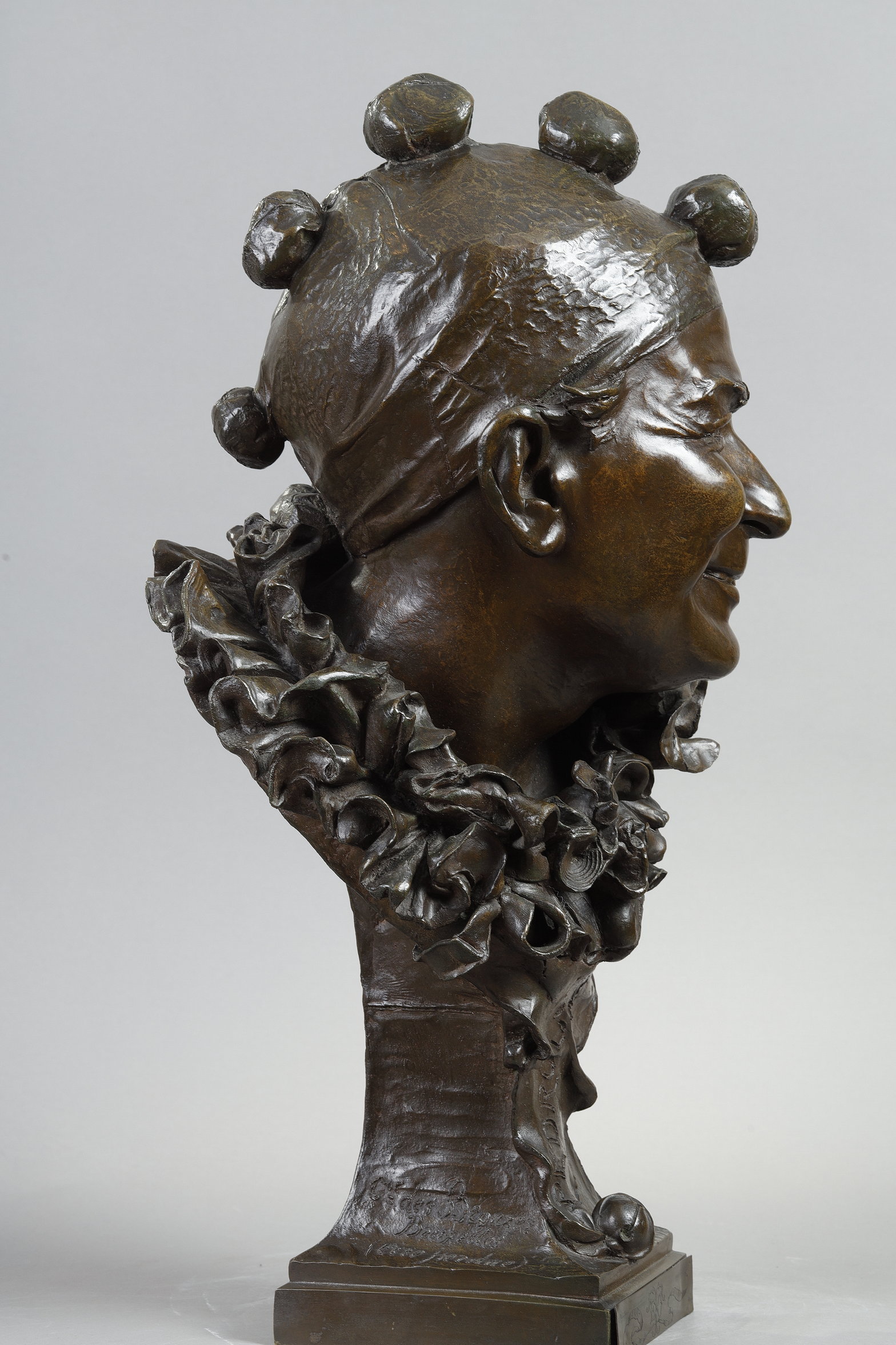 Le personnage est saisi en pleine prestation : un sourire malicieux et complice éclaire ses traits. Le regard pétillant d’esprit, les rides finement sculptées autour des joues et du front traduisent à la fois la joie de divertir et la fatigue d’un artiste observateur de la condition humaine, caché derrière le masque comique. Son large col plissé, exubérant et dynamique, apporte un jeu de volumes qui anime la composition, tandis que son bonnet souple, orné de grelots, évoque ironiquement une couronne de théâtre.