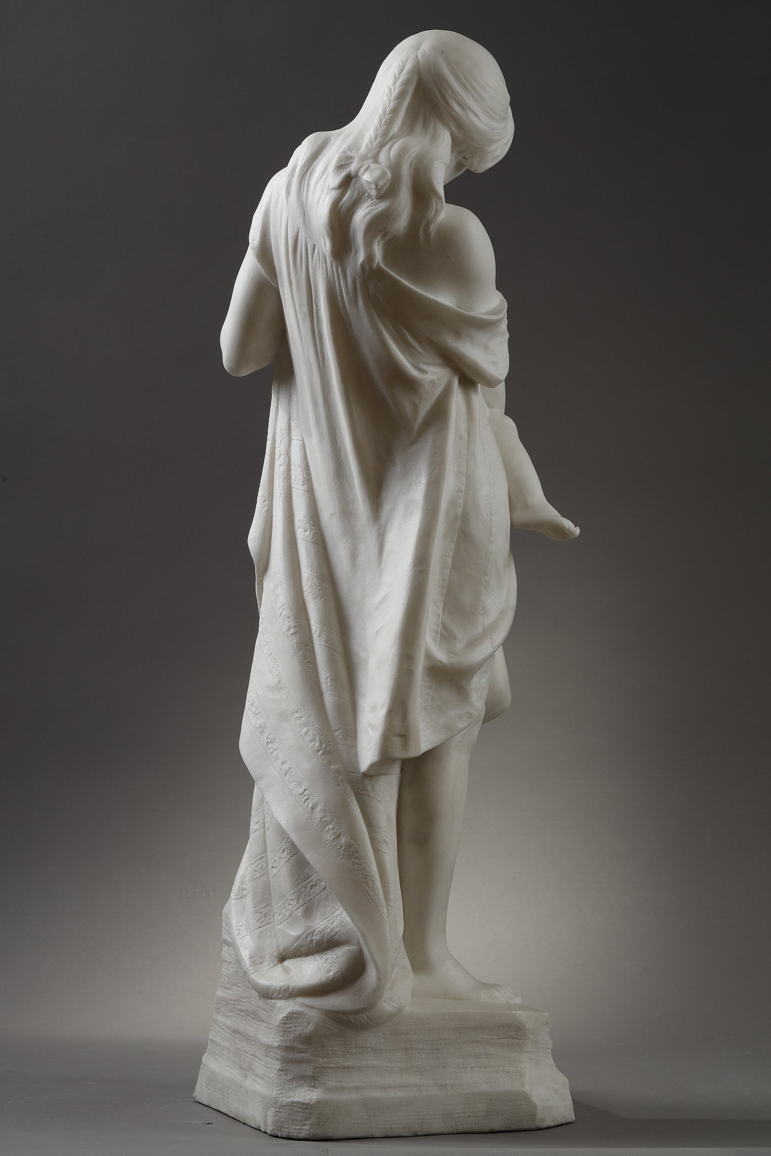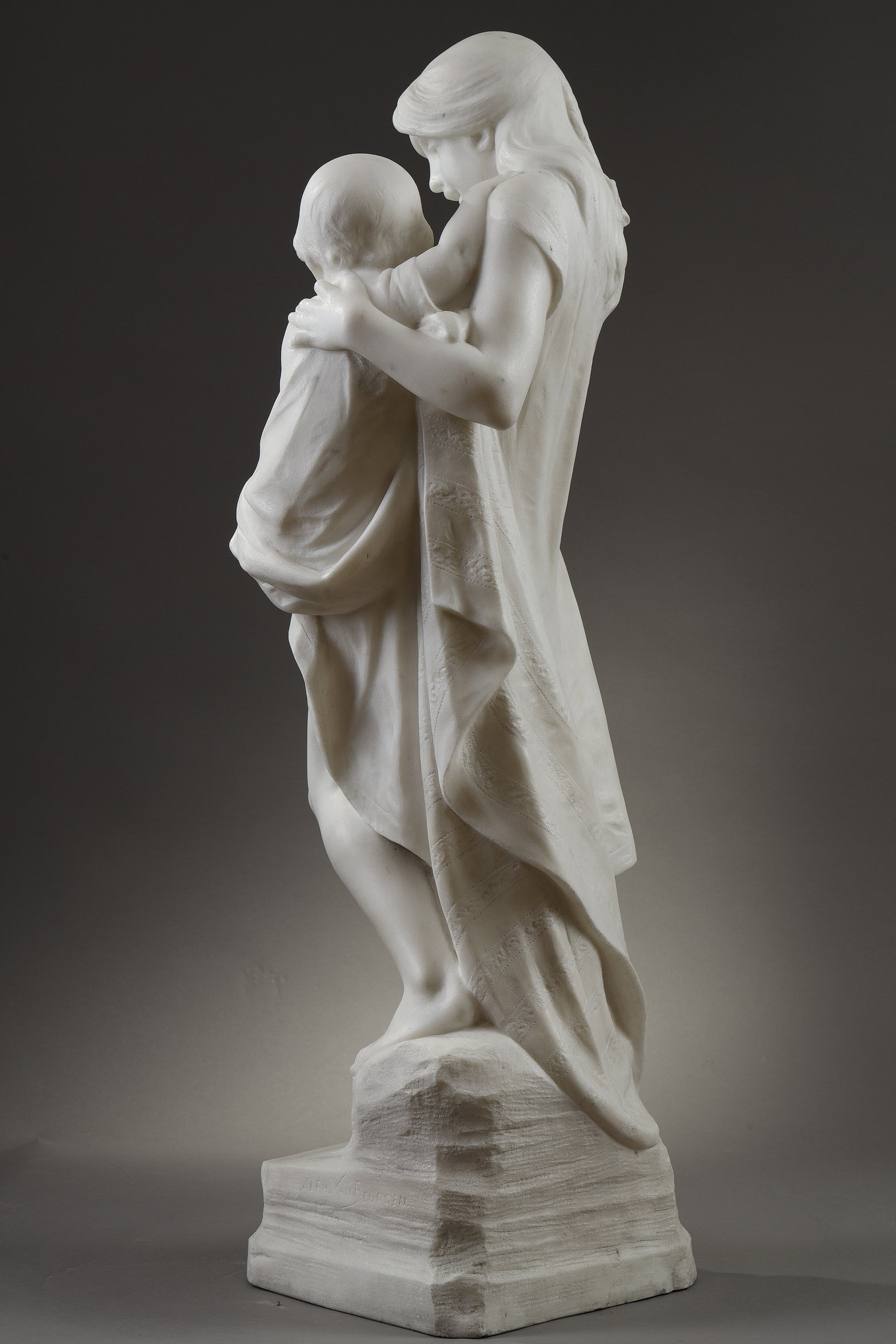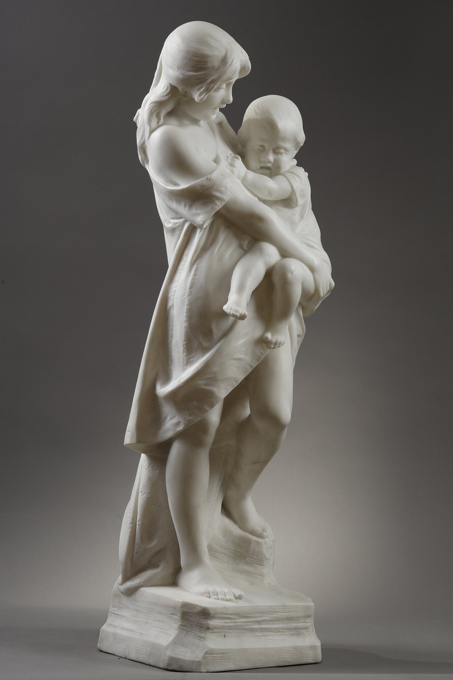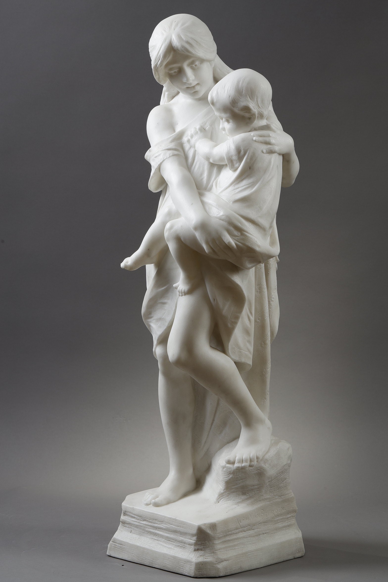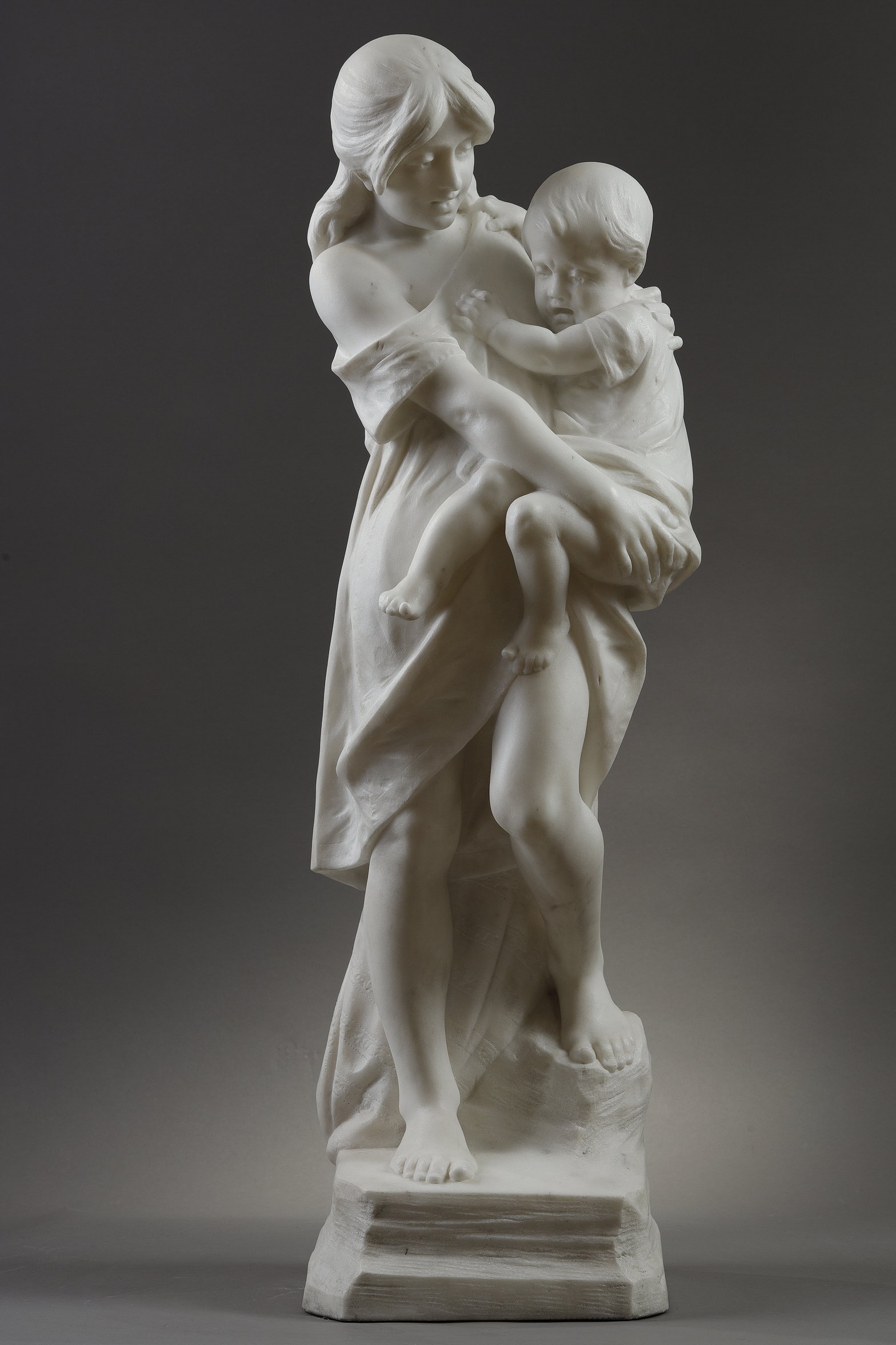 Dans Mère & Enfant, le sculpteur belge Alphonse Van Beurden saisit un moment profondément émouvant de tendresse maternelle. Une jeune mère enlace son enfant avec une douceur infinie ; celui-ci s’accroche à elle, manifestant une dépendance affective touchante. Son expression calme et aimante, sa posture protectrice et la fluidité naturelle de sa robe renforcent la profondeur émotionnelle de la scène. Une main appuie le dos de l’enfant tandis que l’autre soutient sa jambe, formant une étreinte à la fois physique et affective sculptée dans le marbre.