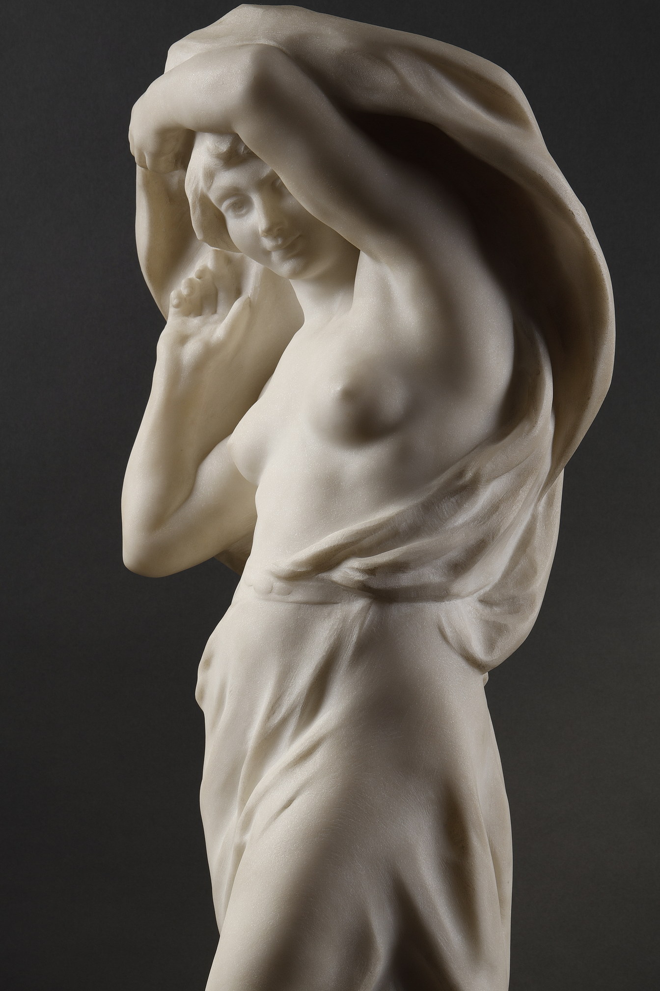 Finot offers a poetic personification of Aurora, the Roman goddess of morning, rendered with a perfect balance of sensuality and restraint. The figure’s pose evokes the serene emergence from slumber—her upper torso defined with anatomical precision, while her lower body and head are cloaked in swirling drapery that dissolves into abstract folds, symbolizing the ethereal nature of dawn itself.