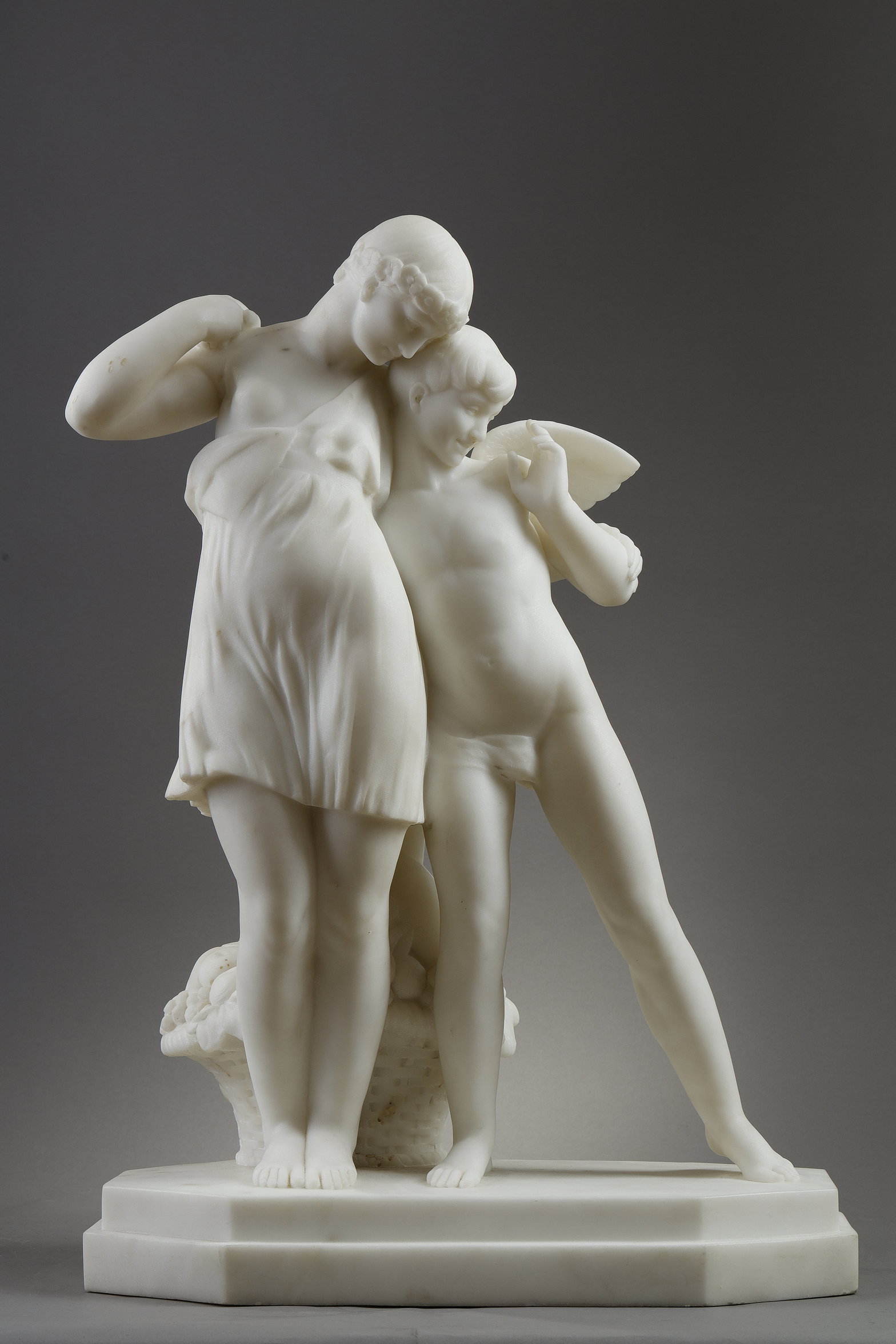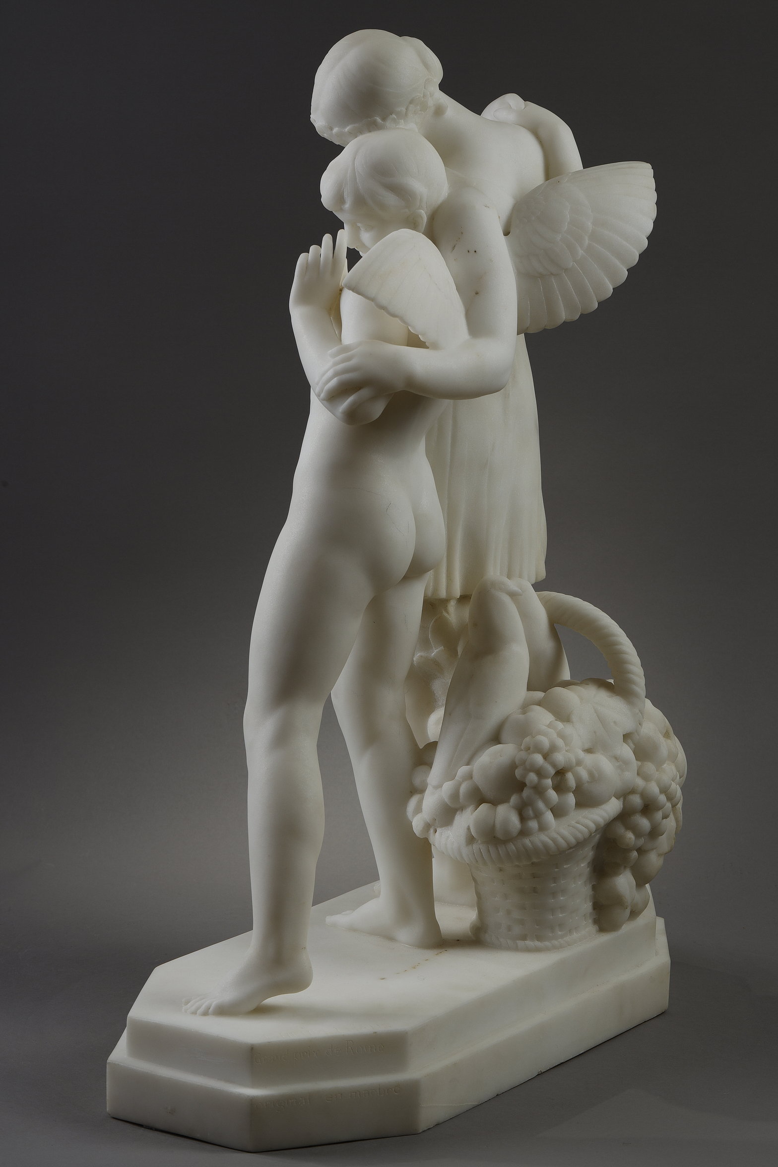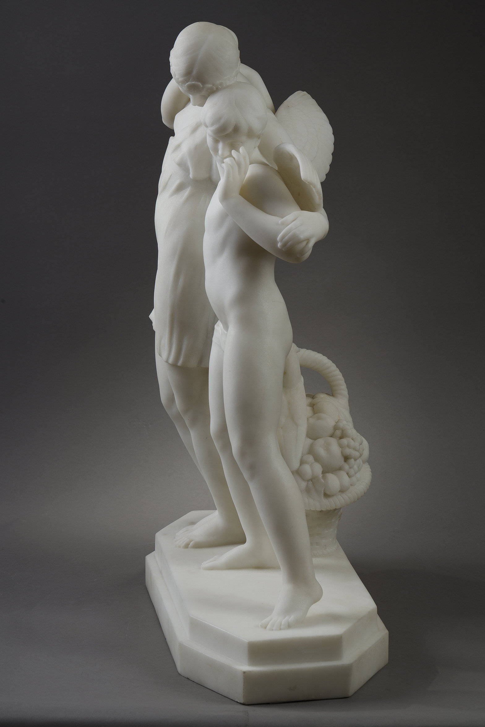 This superb marble sculpture by French artist Lucienne Heuvelmans, titled Youth and Love (La Jeunesse et l’Amour), is a pivotal work in her career—directly connected to her acclaimed project Les Illusions et le Regret. With youthful affection at its core, the composition exemplifies Heuvelmans’ poetic vision in stone.