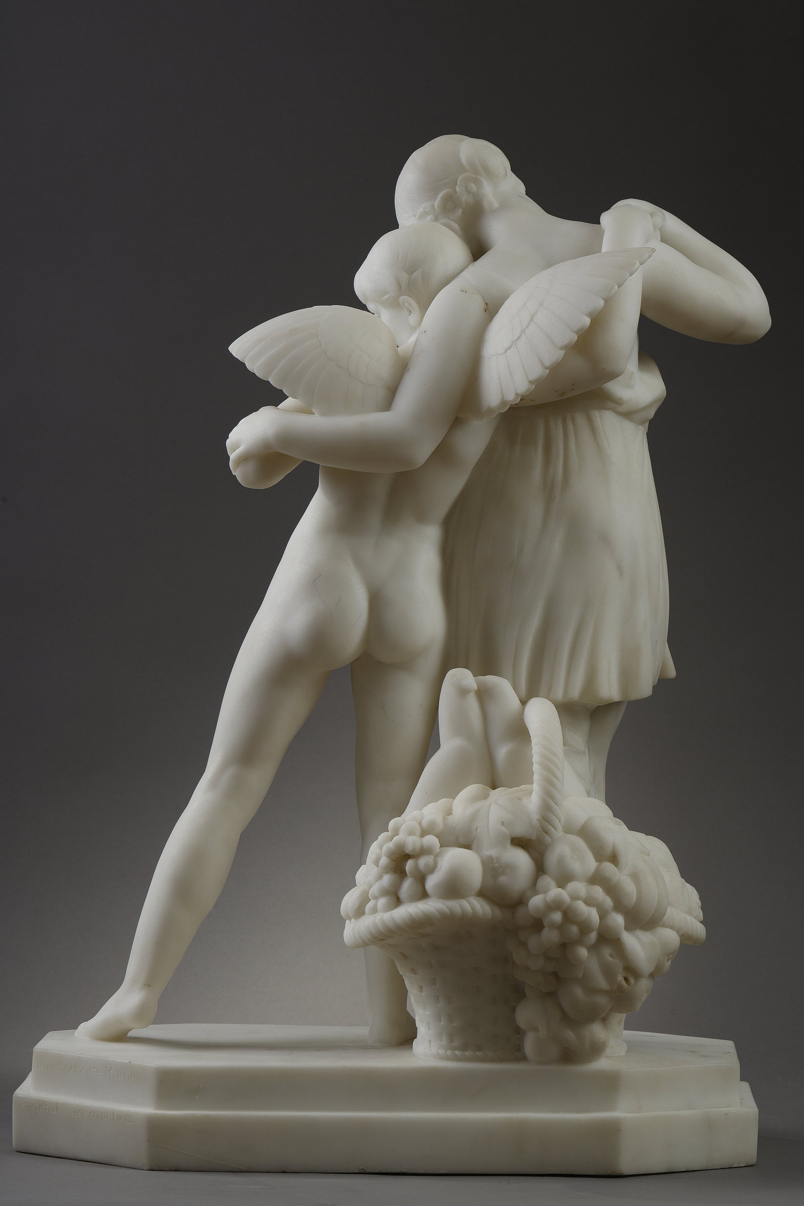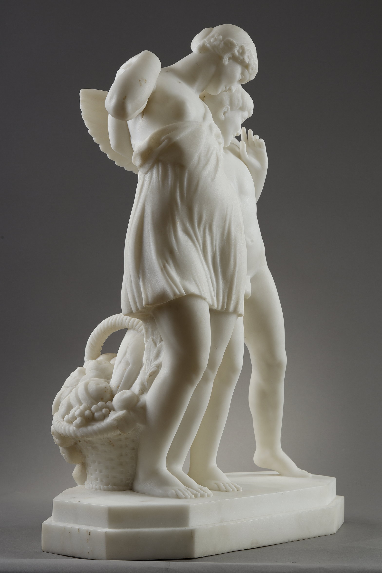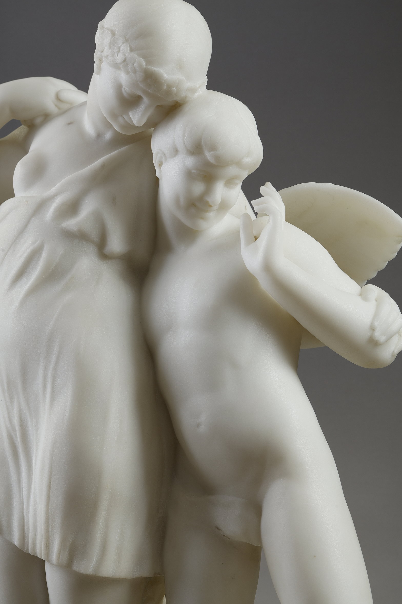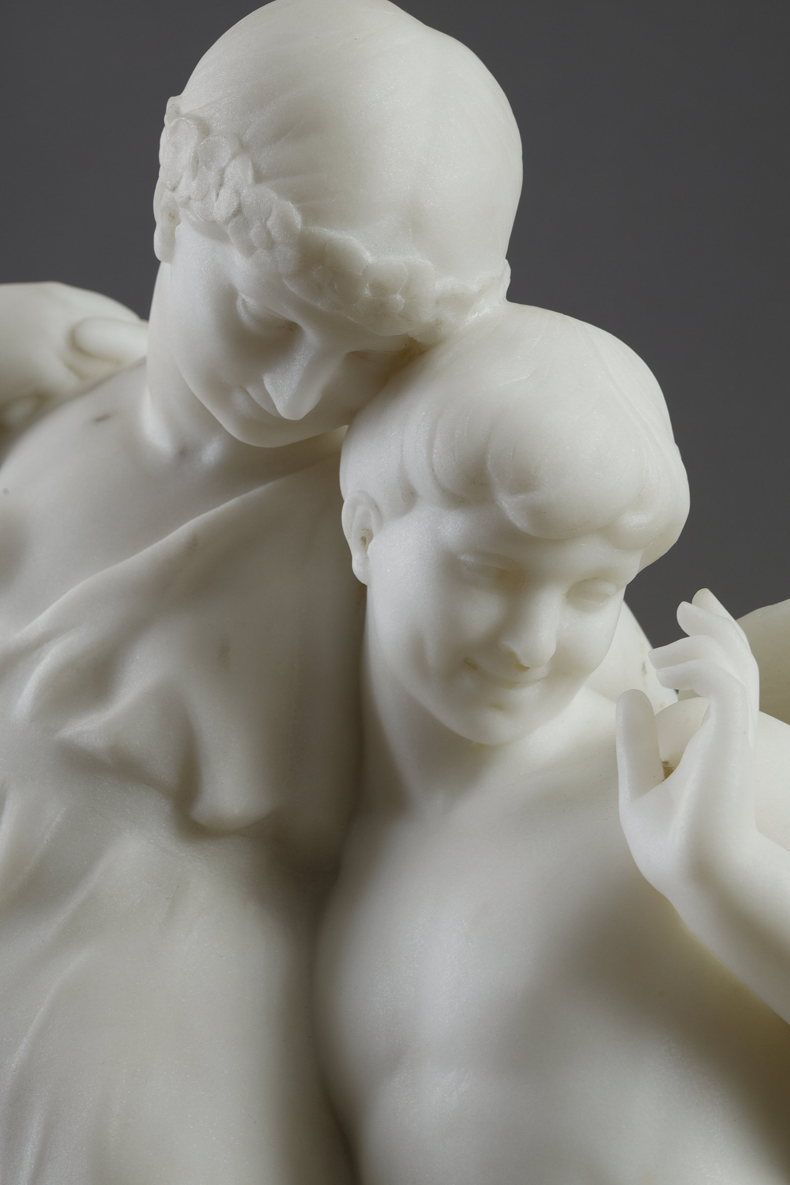 Attention to detail is exceptional. The drapery falls naturally, conveying lightness; the youthful softness of the forms, the gentle tilt of their heads, and the intertwined arms express trust and tenderness. These subtle choices elevate the sculpture from allegory to universal feeling.